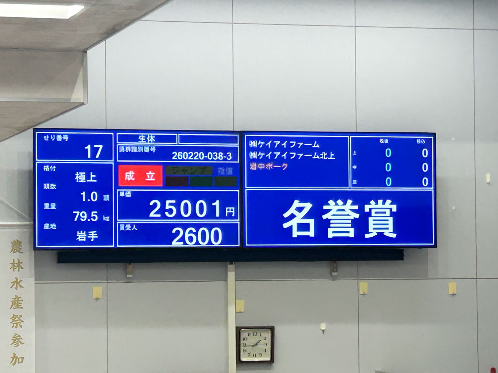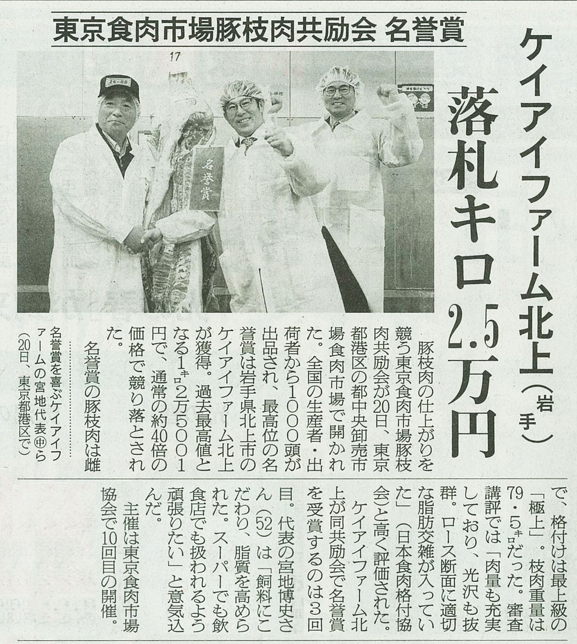 第10回東京食肉市場豚枝肉共励会にて最高位の名誉賞を受賞 2026/3/4 令和8年2月20日一般社団法人東京食肉市場協会主催第10回東京食肉市場豚枝肉共励会において最高位の名誉賞(農林水産大臣賞)を受賞しました。今回、日本最高価格25,001円/kgにて落札していただき、この価格に恥じぬよう皆様に喜ばれる豚肉づくりに精進したいと思います。 前のページに戻る